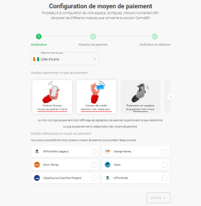 Pour ajouter un nouveau moyen de paiement, utilisez l’option dédiée à la création. Choisissez le pays, le type puis selectionnez le type de moyen de paiement que vous souhaitez configurer (carte de crédit, mobile money, etc.)