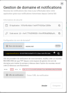 CentralBill fournit des clés d’authentification sécurisées pour chaque application utilisez la mollete de parametre disponible sous “Gestion des domaines et notification” . Recopiez ces clés et assurez-vous de les intégrer correctement dans le code de l’application pour garantir une communication sécurisée.